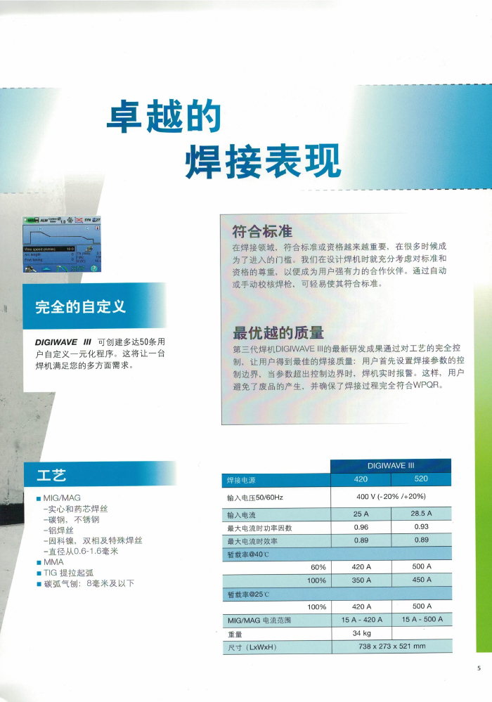 本系列 MIG 焊機(jī)集八大技術(shù)革新和專利技術(shù)( “ 柔性 ” 短弧 / “動(dòng)態(tài)”短弧 / 低噪音脈沖 / 超射流模式 / 熱起動(dòng) /4 階程 / PR-SPRAY 系統(tǒng) / 定序功)于一身,是目前較先進(jìn)的鋁合金 MIG 焊機(jī)之一。獨(dú)到的熱起弧功能保護(hù)在起弧處充分熔合,大于 700A 的熱起弧脈沖峰值電流擊碎表面氧化層準(zhǔn)確而連續(xù)地控制脈沖參數(shù),同時(shí)對(duì)焊接峰值電流不進(jìn)行限制。