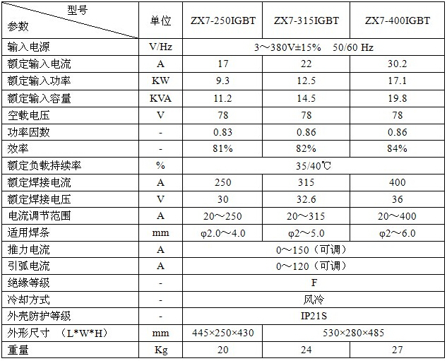 6. 推力電流和引弧電流無級可調,適合于各種酸堿性焊條的施焊;