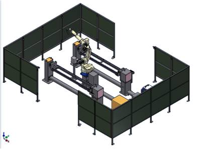 該機(jī)器人焊接工作站主要用于煤機(jī)結(jié)構(gòu)件的自動(dòng)焊接,采用頭尾架式單軸變位機(jī)+六軸聯(lián)動(dòng)機(jī)器人雙工位布局,機(jī)器人安裝于雙工位中間。為方便進(jìn)行多種規(guī)格工件焊接及參數(shù)設(shè)置,控制系統(tǒng)采用三菱PLC+工業(yè)觸摸屏方式進(jìn)行控制和操作,使整套設(shè)備具有更大的柔性及靈活性,并可有效提高生產(chǎn)效率。